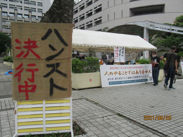 19日、20日は県庁前で、今日から慰霊の日の23日まで平和記念公園で、それぞれ5人の支援者と共に5日間のハンガーストライキを行っている。