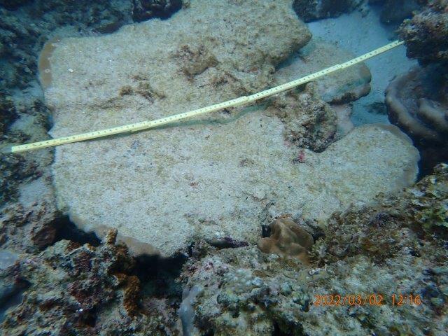 サンゴ投棄現場。ダイビングチーム・レインボーによる調査。60cm以上の切り口が上を向いている。