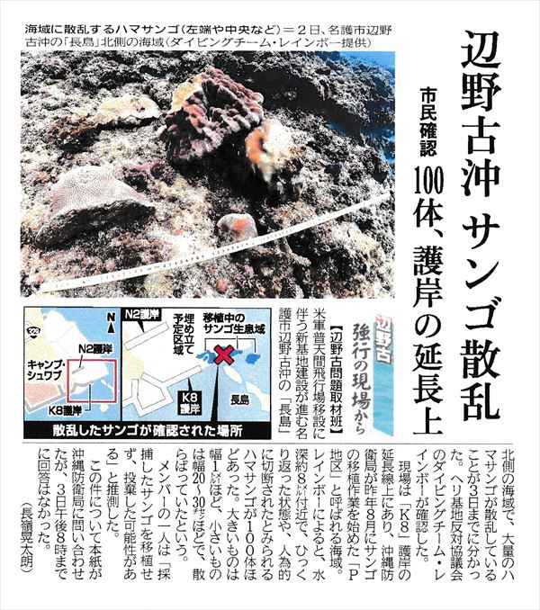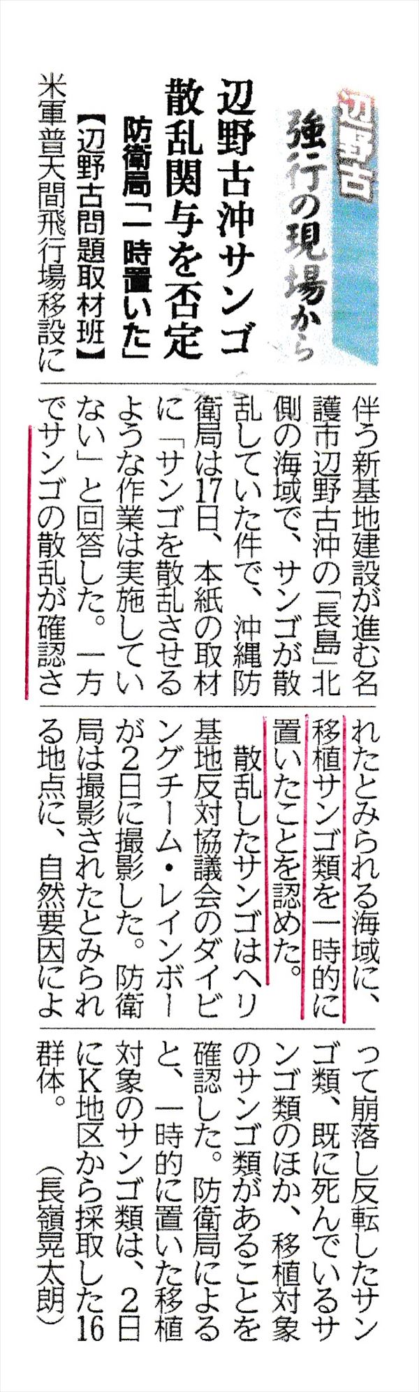 今朝(18日)の新聞報道によると、沖縄防衛局はこのサンゴが移植のために切り取った珊瑚であると認め「一時的に置いてあっただけだ」と言い訳しているという。