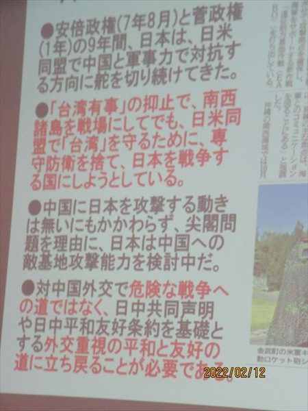伊波洋一さんは、これまで参議院外交防衛員会で、一早く「南西諸島への陸自地対艦ミサイル部隊配備などの新基地建設は、アメリカが東アジア覇権を維持するための台湾防衛戦略に日本を関与させ、日米共同で中国の『台湾有事』に対処しようとするもので、尖閣防衛のためではない」と指摘。中国との懸案事項は粘り強い日中外交交渉よるべきでアメリカの軍事力に頼るべきでない。と訴えてきた。