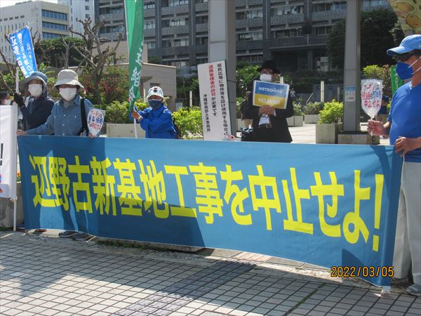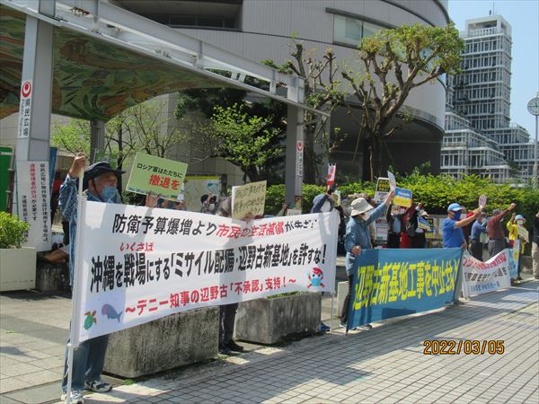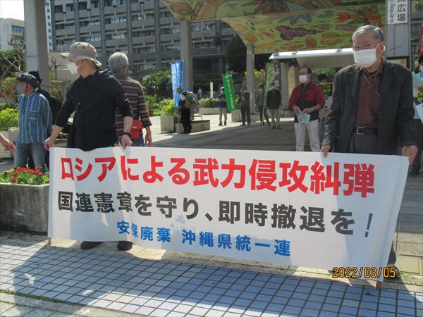 那覇地区は、今日(5日)午後3時から県庁前の県民広場で、那覇島ぐるみの会や平和市民連絡会、統一連などが、辺野古新基地建設とロシアのウクライナ侵略に抗議するブルーアクションを展開した。