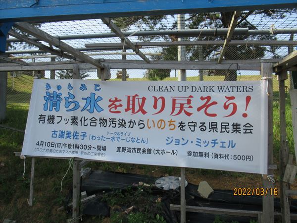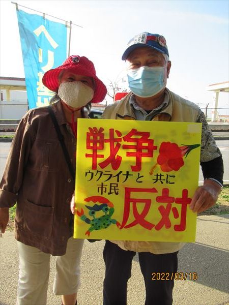私たちの他に一番乗りは、隣村・宜野座から毎日やってくるこの方、元教師で労働運動のリーダーも担ってきた筋金入りの闘う人だ。手作りのプラカードがステキだったので、写させてもらった。