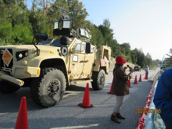 私たちが座り込んだ目の前を爆走する米軍車両。演習の激化が肌感覚でわ伝わってくる。