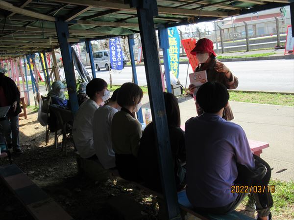 正午前の2回目は、学生たちも一緒に座り込んだ。