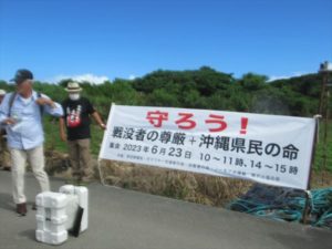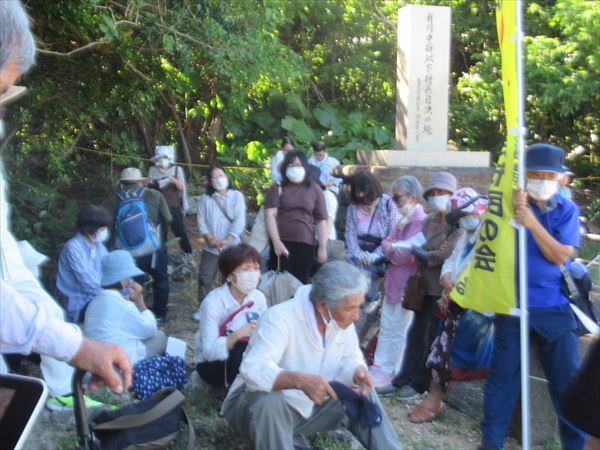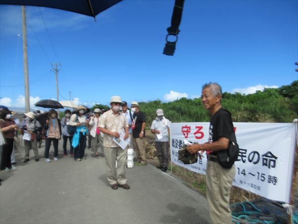 午後3時、熊野鉱山前の農道に60人余が集まった。まず、具志堅隆松さんが戦没者の遺骨が混じる南部の土砂問題について全般的な話をした。「遺骨が混じる南部土砂問題は、沖縄だけの問題ではない。日本だけでもない韓国の兵士も3500人くらい戦死しているがほとんど遺骨は帰っていない。もちろん米兵も。このことを全国、世界に知らせて行きたい。特にアメリカは遺体を大事にする。戦場でも戦死者をどんな困難な中でも連れ帰る。過酷な戦場だった沖縄戦ではそれでも取り残された戦死者もいたのだ。それを知れば外交問題に発展する可能性もある」と。さらに「国は、遺骨が眠っていることを知りながらこの計画を立てた、と言っている。人の道にも外れた所業である」と憤った。  続いて北上田毅さんが、熊野鉱山の開発問題の経過と問題点を説明。北上田さんの話を聞いていると、鉱山開発にについては、地域や県の権限も多く、県もがんばってはいるが、それは市民らに突き上げられて、と言う感じを受けた。