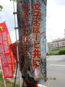 「文子おばぁと共に 戦争に反対しよう」。新しい幟がはためいていた。(裏写りして読みにくいが…)