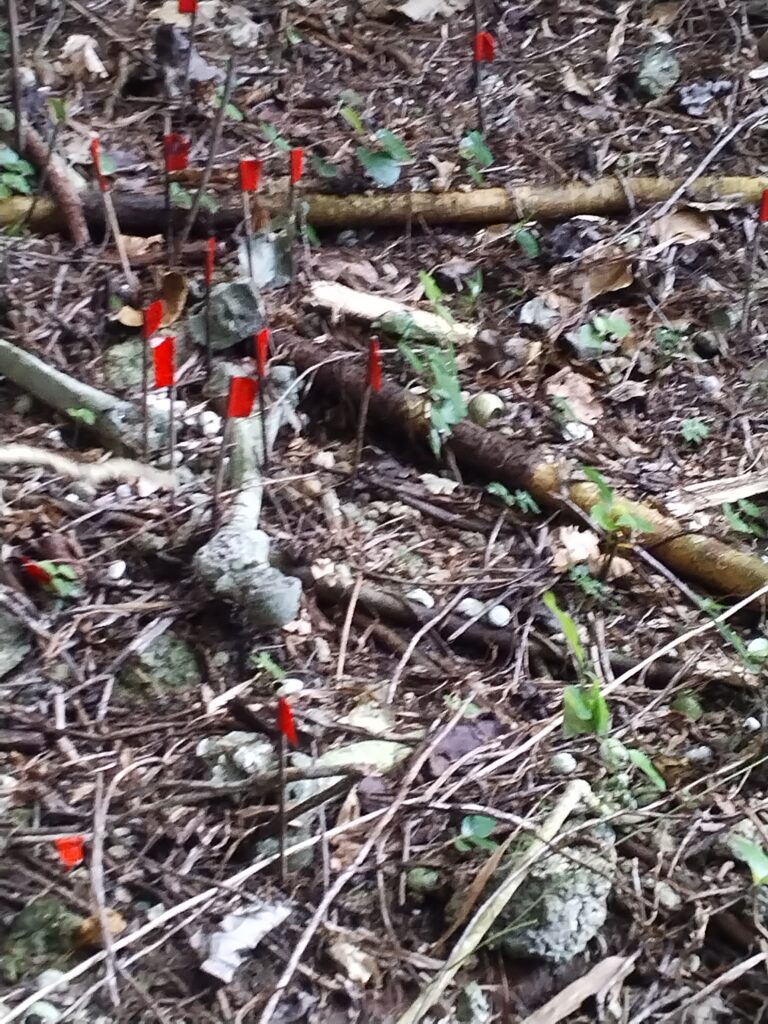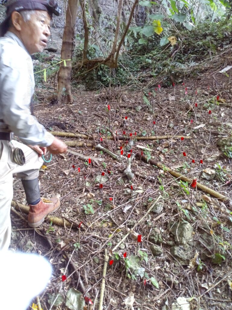 遺骨が見つかった場所からさらに2メートルほど緩やかな坂を登ったところに、小さな赤い旗が無数に立てられている。なんとこれがすべて遺骨や遺品の存在を示しているという。