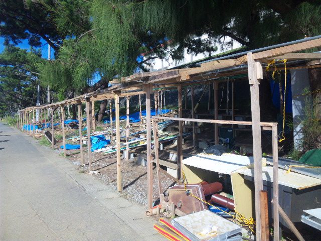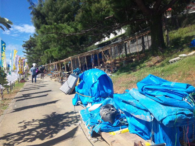 台風のたびにテントを外したり張り直したりするのはボランティア・スタッフ。「縁の下の力持ち」と、言葉では簡単に言えるが、その労力は大変なものだ。台風のことだけでなく、テント村の毎日の営み、この方々がいないと成り立たない。いつも心の中で感謝の頭を下げている。