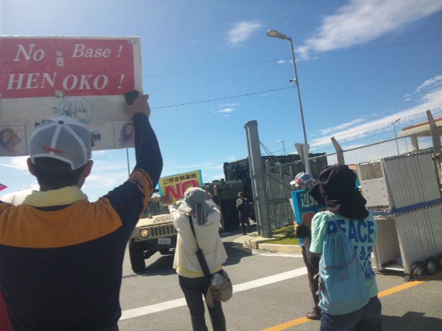 今日も、少人数でゲートから出る軍用車両を止めて抗議行動。機動隊に難なく排除されてしまうが、それでもひるむことなく声をあげ続けた。