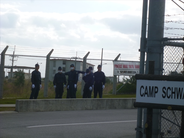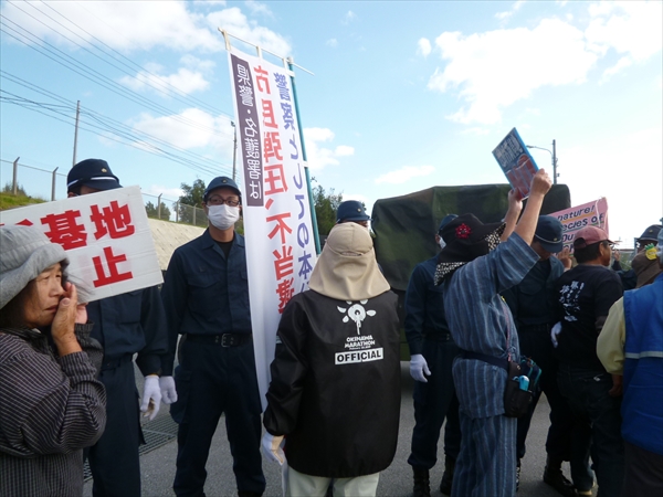 米軍車両を止めて15分もしないうちに待機していた県警の機動隊が、米軍を助けにやってくる。午前中は何度もその繰り返し。いまも毎日行っている。