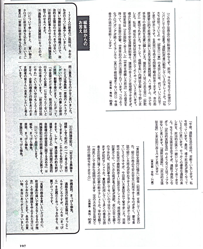安倍政権の戦争法に反対を表明したことで、「通販カタログなのに、政治的な主張をするとは!と、会員・読者の一部(172名)から批判を受けた「通販生活」が、この批判をしっかり受け止めたうえで、生活は政治に直結しており、従って「金儲けだけ考えて、政治の話に口をつぐむ企業にはなりたくない」と見事な反論をしています。その素晴らしい見識に感動しました。