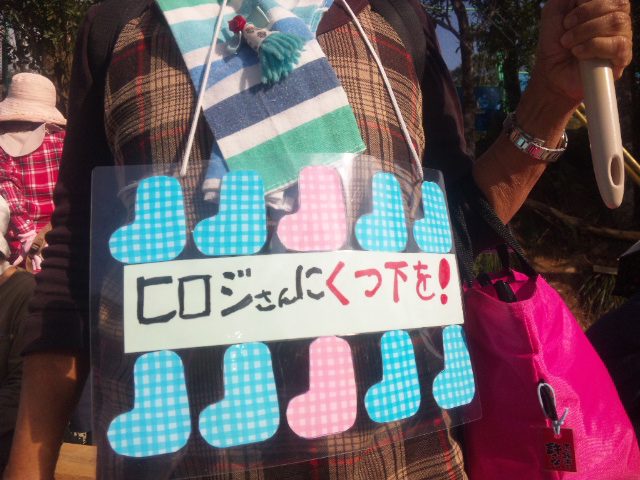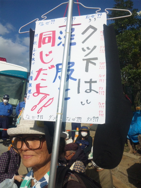 いまだがん治療中の山城さん、「足が冷えるので靴下がほしい」との要望で、家族が靴下を差し入れたところ、名護署がこれを認めないことに対し、みんなで抗議した。