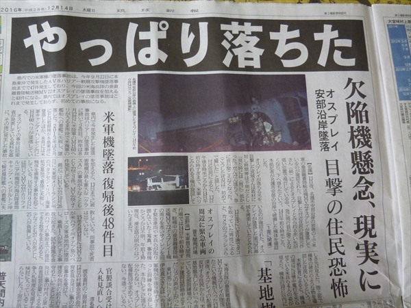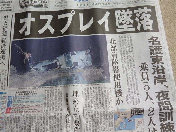 墜落したオスプレイは、真っ二つに割れ、大破したにもかかわらず、米軍は「墜落ではなく、あくまで不時着」と発表。NHKも昨夜のニュースから不時着と報じたが、地元新聞(新報、タイムス) は第一報から「墜落」報道している。墜落を不時着とすることで事故を矮小化することは許されない。