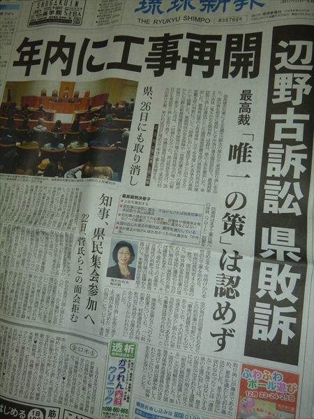 判決を受けて翁長知事は「最高裁の判決は出たが、この闘いというか新辺野古基地は造らせない、オスプレイの配備撤回というのは、今まさに新しいスタートに立ったと思う。これからが私たち県民の踏ん張りどころ、力の出しどころだ」と記者団に語った。