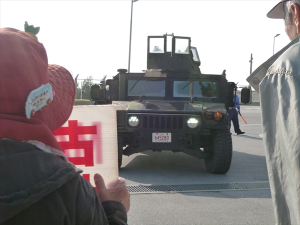 前日の大雨の中の抗議集会とは打って変わって、小春日和とい言いたいような穏やかな日差しの中、機動隊とも穏やかに対峙した。が、すぐに上空を飛ぶオスプレイが、私たちを現実の厳しさにひき戻す。