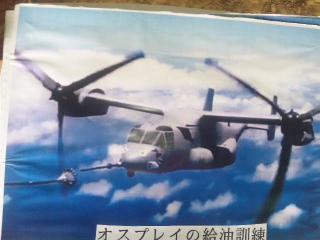 オスプレイの空中給油訓練。給油ポンプが外れた瞬間。市民から名護市議会に提供された写真。