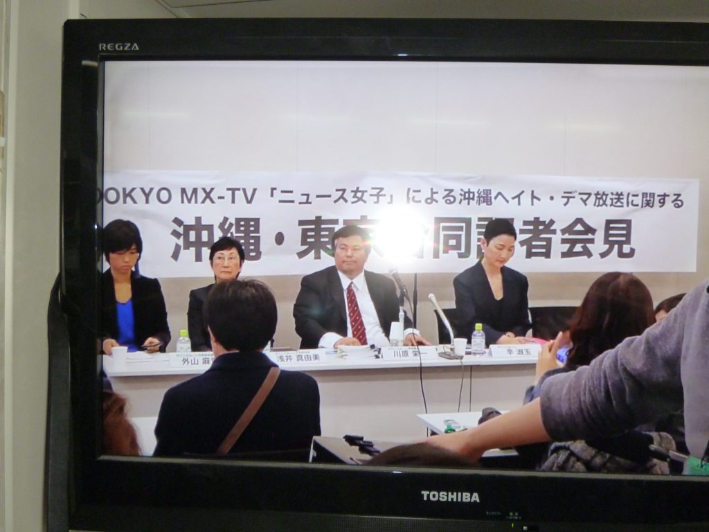 今日(27日)、あまりにもひどいヘイト番組に対し、東京と沖縄でネットで結び、抗議の共同記者会見が行われた。