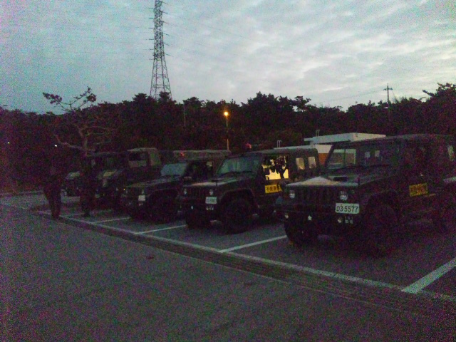 いつもトイレ休憩をとる伊芸のサービスエリアで、迷彩色の自衛隊の一団と遭遇した。聞くとこれからキャンプシュワーブで行われる爆破訓練に参加するという。
