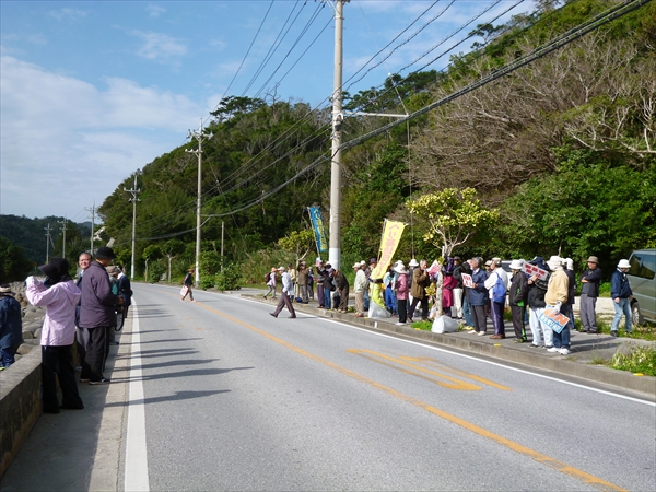 それでも海では抗議船とカヌーの辺野古ブルーが海保と対峙を強いられている。50人ほどが大浦湾が間近に見える瀬嵩の浜近くに移動して、海上の抗議行動を激励することになった。