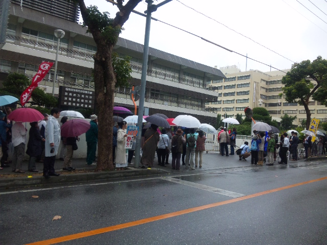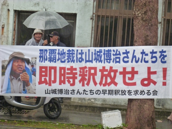 裁判所前での抗議行動は、今日を起点に、山城さんら3人が釈放されるまで、毎日行われることになっている。(曜日によって抗議集会の時間が異なります。詳しくは平和運動センターにお問い合わせを)