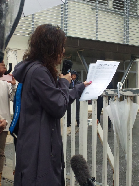 この抗議集会の中で、乗松聡子さん(ピース・フィロソフィー・センター代表)が、国際人権団体アムネスティ・インターナショナル(本部ロンドン)が27日に発表した山城さんらの即時釈放要求の原文(英語)を読み上げ、「日本は、国際人権規約の批准国として、不当勾留を直ちに解消せよ」と訴えた。