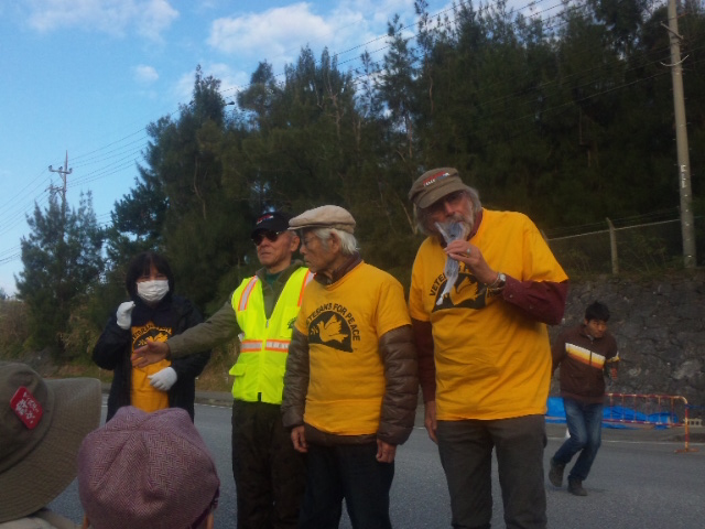 ベテランズ・フォー・ピース(平和を求める退役軍人の会)沖縄支部の皆さん。元海兵隊のダグラス・スミスさんは、「金網の中の人たちを敵視するだけでなく、あの人たちにも真の平和の行動を働きかけてください」と訴えた。「本当のことがわかれば、兵士たちも変わることができる。その証明が私たちです。かつては、あの金網の中で、正義のためだと思って働いていた。でも違うと気が付いて、変わったのです」