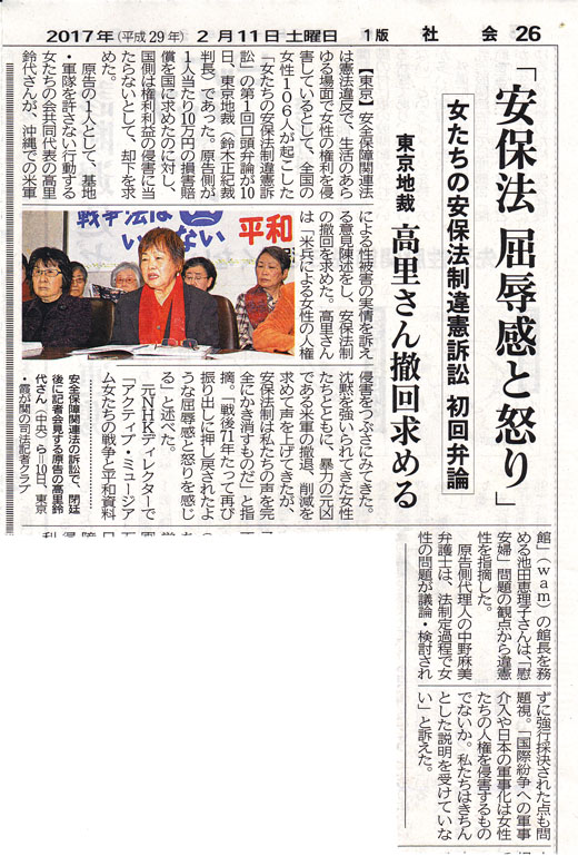 女たちの安保法制違憲訴訟始まる~女性たちが軍隊の性暴力に晒される 安保法は憲法に違反していると、全国各地で違憲訴訟が行われているが、女性たちが訴えた「女たちの安保法制違憲訴訟が、11日、東京地裁で始まった。 特に沖縄からは、米軍の長期駐留によってもたらされた、軍隊による女性へのすさまじい性暴力の実態を明らかにし、「安保法によって、さらに女性たちが暴力に晒される」と、基地軍隊を許さない行動する女たちの会・共同代表の高里鈴代さんが、意見陳述を行った。 <沖縄タイムスより> 沖縄~平和のメッセージ 2017年2月13日unaiリンクURL この記事を共有する → Tweet Pin It