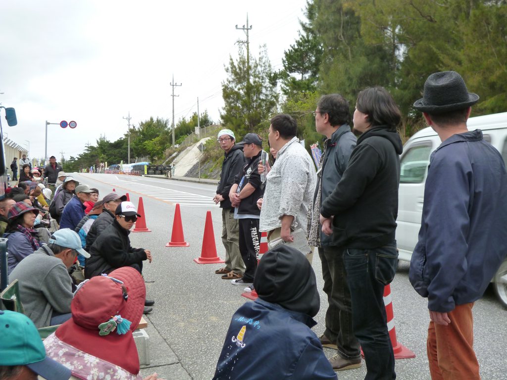 毎週土曜日は、赤嶺衆議院議員がゲート前に駆けつける。赤嶺議員の国会報告はいつも的確でわかりやすい。