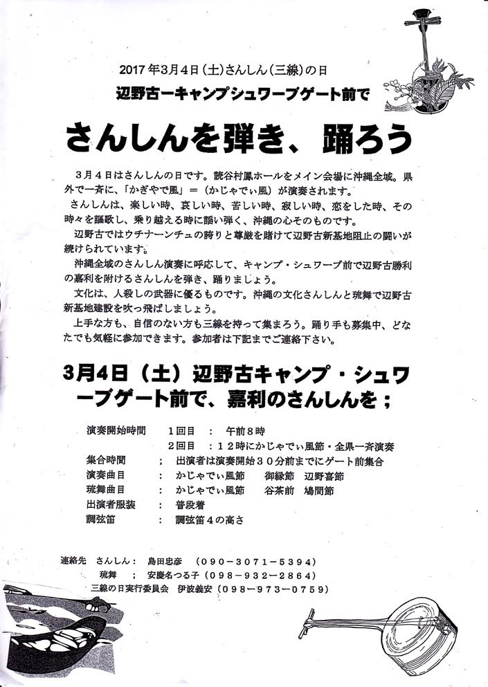 今年も3月4日「さんしんの日」は辺野古ゲート前に注目です!