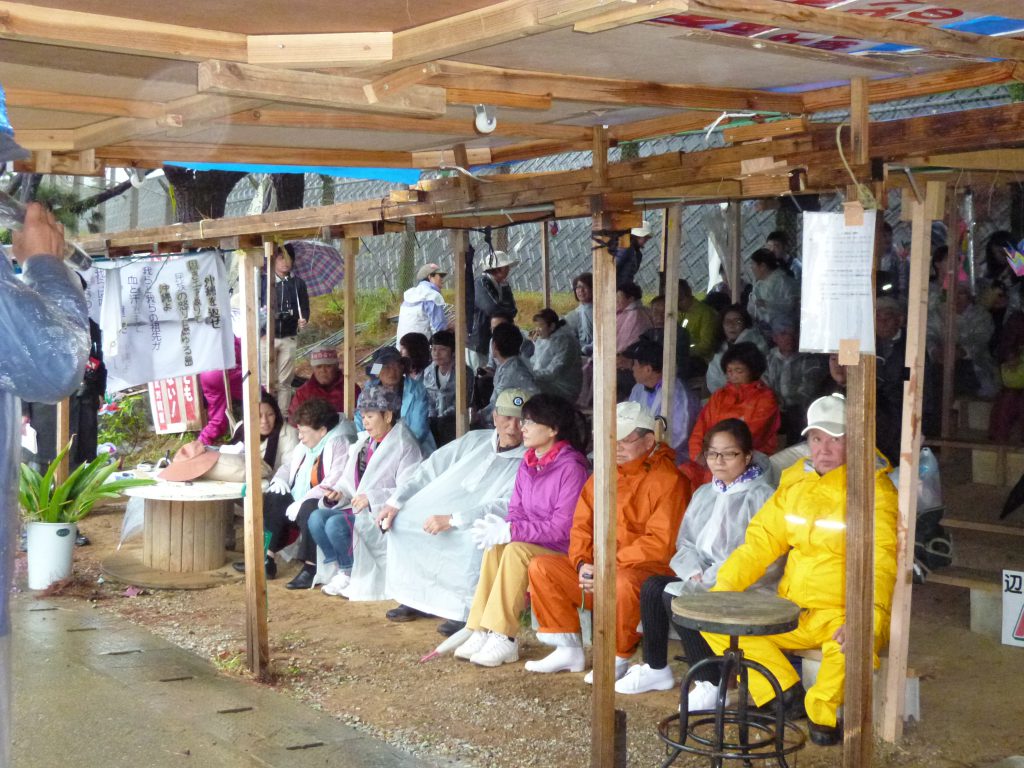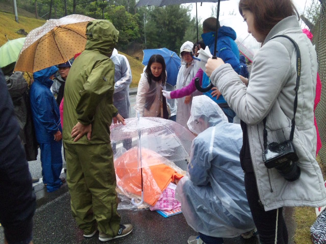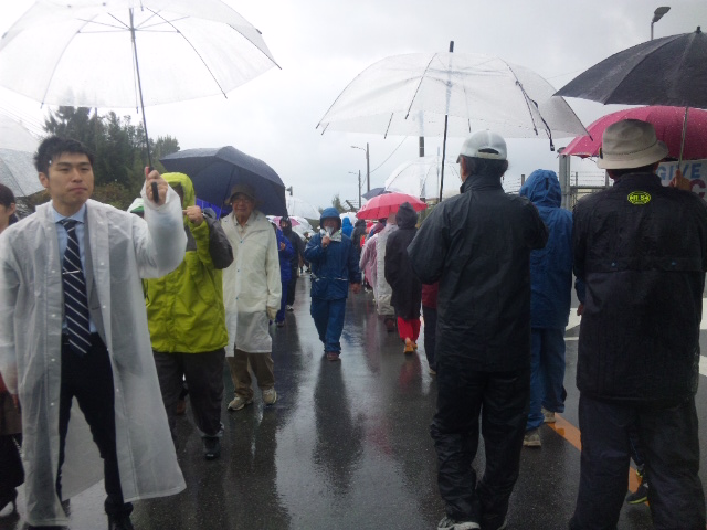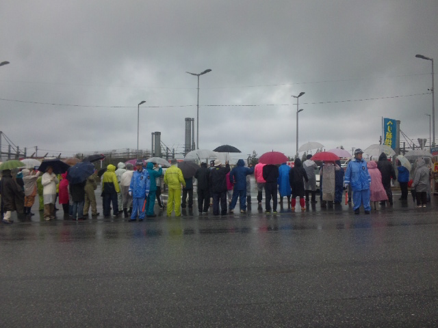 今日は、あまりに雨が激しいので、いつもの工事用ゲートではなく、メインゲート向かいのテントの下で集会が行われた。
