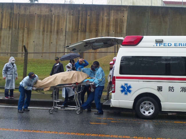 工事車両を止めようとした市民らを機動隊が強制排除する際に、一人の女性が機動隊に引きずり倒されて頭を強打し、救急車で運ばれた。