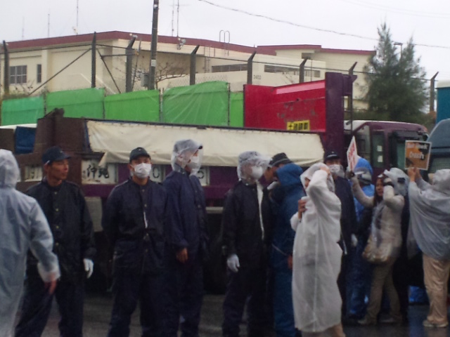 工事車両が向かっているとの情報で、工事用ゲートに駆けつけたが、3台のトラックの侵入を止めることができなかった。