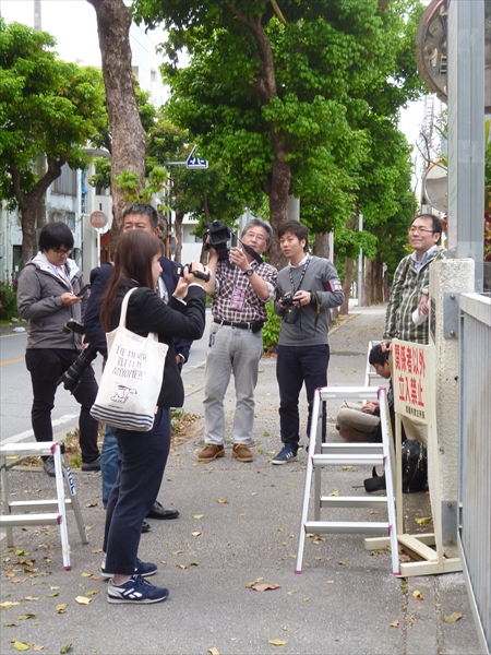 19:50 警備員が一人やってきたので、「いよいよだ!」とみんながザワついた。が、「一旦、門扉を閉める」という。「えーっ!どうして?閉めないで!」と、女性たちの間から悲鳴のような声があがった。大城事務局長が「整然と出迎えるから門を閉めないでほしい」と交渉。数分後上司らしいもう一人の警備員が来て話し合いの結果、そのままでいいと認められた。