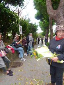 開けられた門扉の一歩内側には、妻の多喜子さん、弟さんご夫婦と平和運動センター大城悟事務局長を先頭にして、花束を抱えた支援者たちが並んだ。