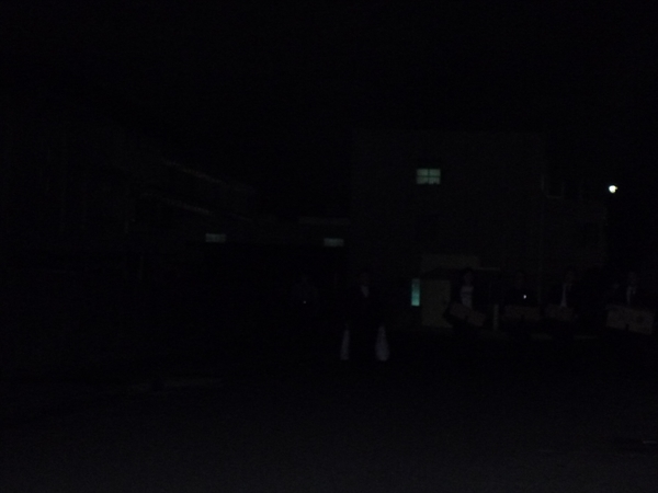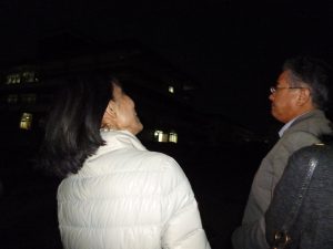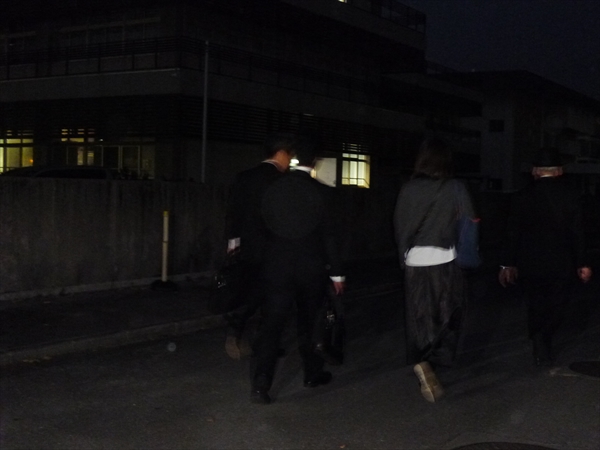 遠くに5人の人影。暗いのでその中のだれが博治さんかは判別がつかないが、4人の弁護士と、真ん中の人が博治さんにちがいないと思われる。