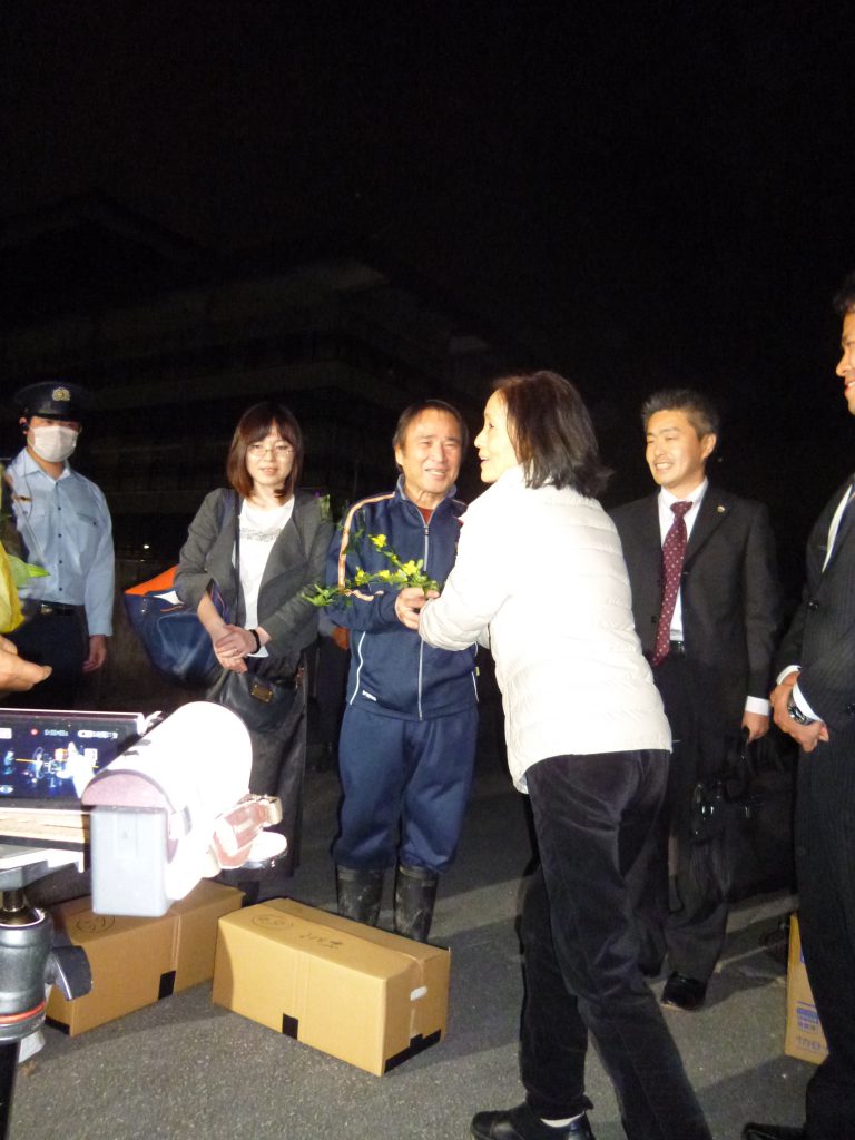 (初公判があった前日17日夜も、ネットで保釈の情報が広がり、多くの人たちが拘置所前に駆け付けたが、裁判所の保釈決定を不服とした地検の抗告で保釈されなかったこともあり、保釈がおるにしても連休明けになるのではと思われていたので、突然のうれしい知らせだった。