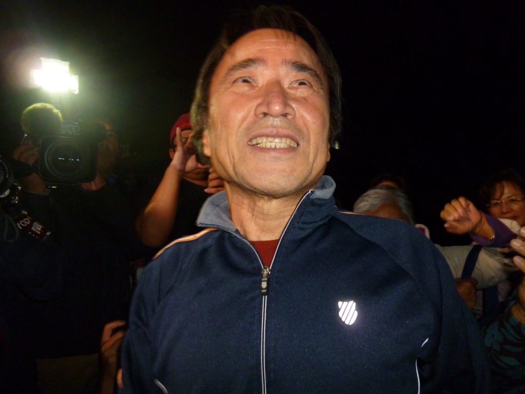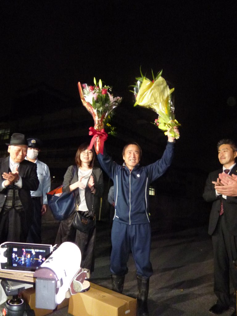 両手の拳を高く突き上げ、人々の歓声に応える博治さん。第一声は「一日千秋の思いでこの日を待ちわびていました。何より元気で皆さんと再会できて、こんなうれしいことはありません」。