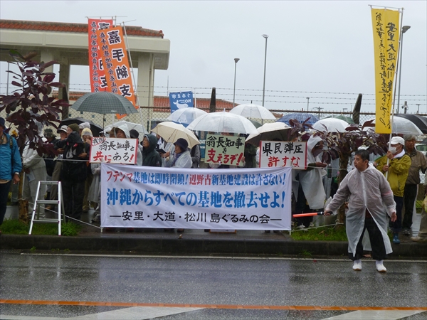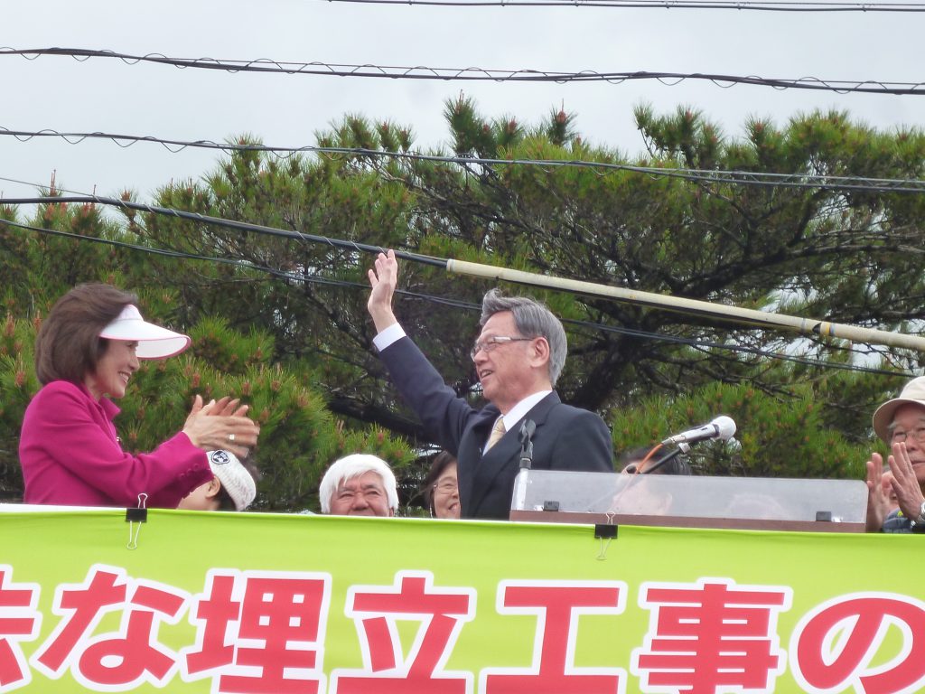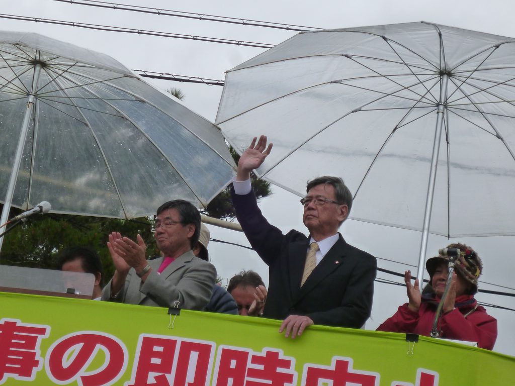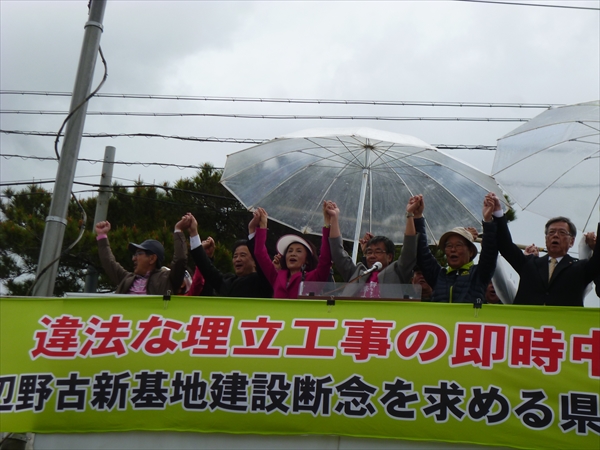 「私は(埋め立て撤回を)必ずやる!」と力強い決意表明に、集まった人たちを沸かせた翁長知事。就任以来翁長知事が辺野古の座り込み現場に来たのは初めて。
