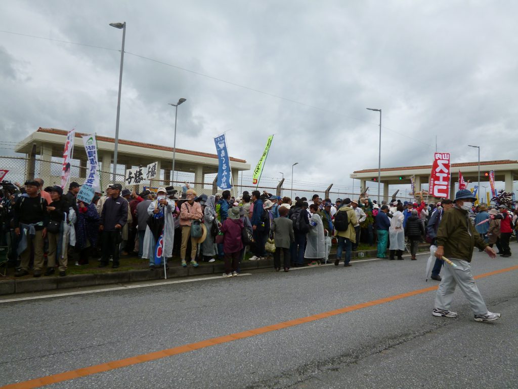 キャンプ・シュワブ前県道の両側を埋めた人の波。早朝から降り続いていた雨も、集会直前には上がり、途中日も照るほどに。天も沖縄県民の味方をしたようだ。