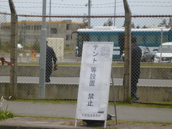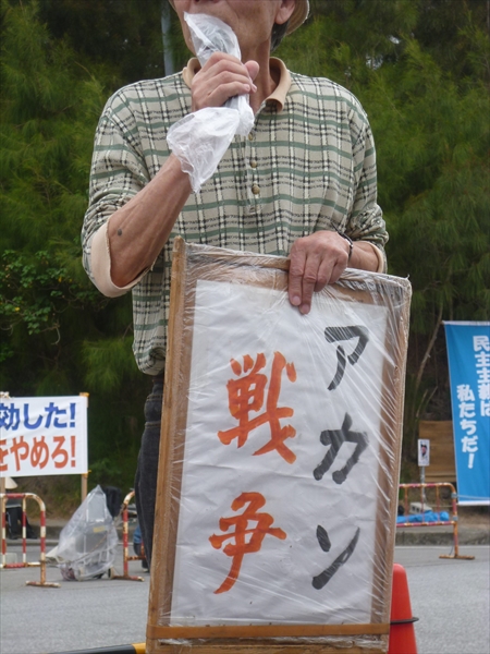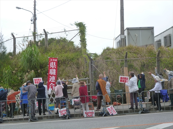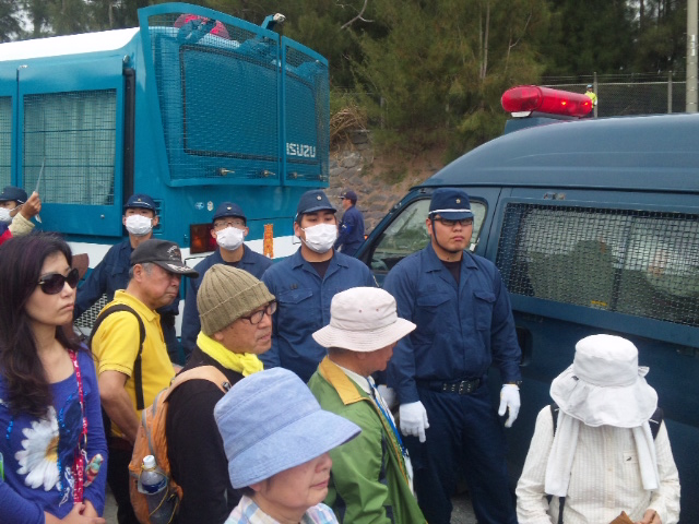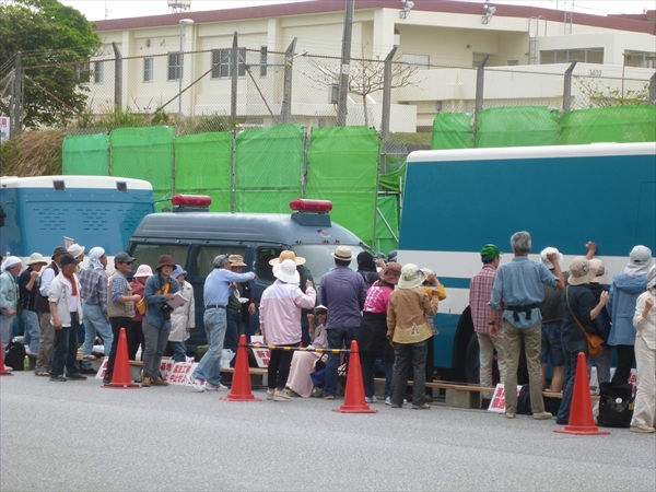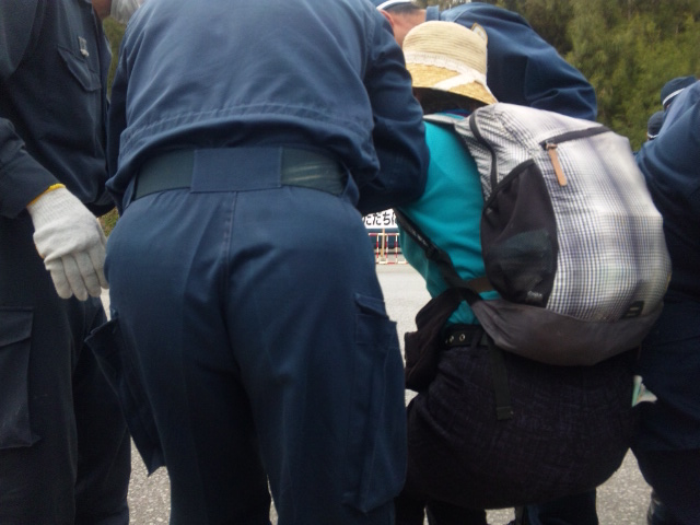 しかし、悔しいかな権力の力は圧倒的。力づくで座り込む人々を排除し、檻の中に閉じ込めて、工事車両を基地の中に招き入れる。集会が終了する3時直前に工事車両の車列が向かっているとの情報が入り、集会を4時まで伸ばしたが、40分間の攻防の末、結局はごぼう抜きされて埋め立て資材を積んだ14台のトラックに入られてしまった。