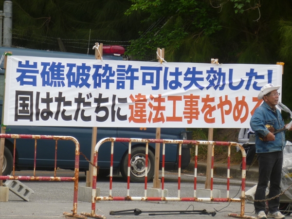 今日から新しい横断幕が張り出された。3月31日で前知事が出した「岩礁破砕許可」は期限切れで失効し、4月1日以降、国は違法工事を行っている。