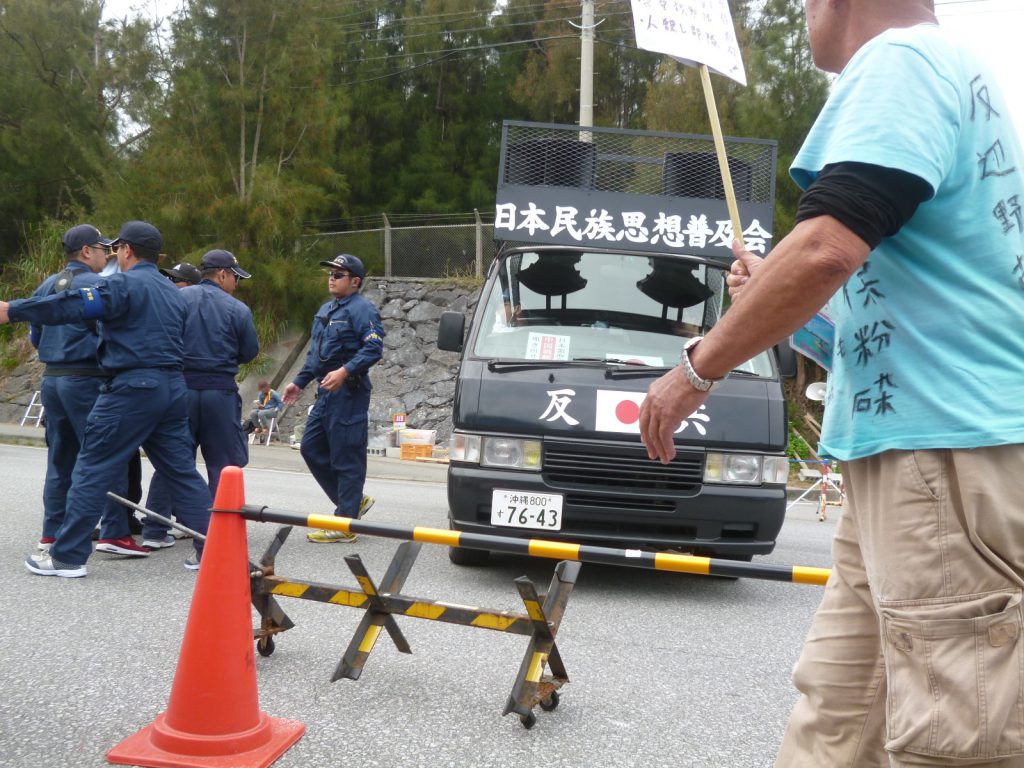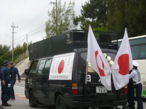 <元気づく右翼~阿部総理がついているもんネ> 座り込んでいる市民の列に向かって突っ込んでくる右翼の街宣カー。さすがの県警も慌てて規制した。