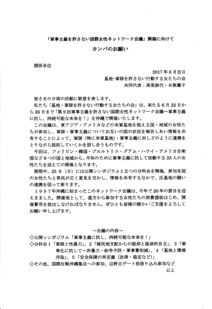 なお、遠方から参加する海外の女性たちへの旅費の援助など、会議運営に多大な費用が掛かります。カンパのご協力もよろしくお願いいたします。