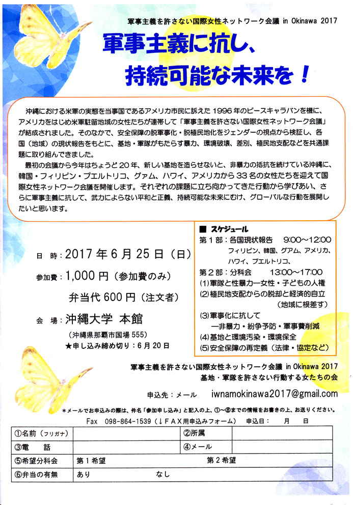 沖縄と同じように米軍基地を抱え、その被害に苦しめられている国々(地域)の女性たちが手をつなぎ、どうしたら武器によらない平和、真の安全保障を確立することができるか、ジェンダーの視点から問い続けている集いです。