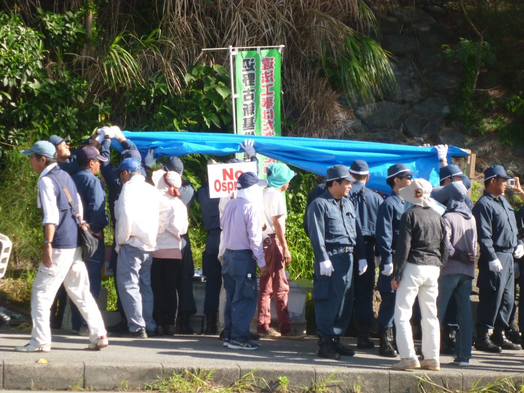 7:30に集会が始まり、間もなく機動隊の指揮官がやってきて、今度はゲートの道路向かいに設置されている救護班用の小さなテント(ブルーシートの簡易テント)を「撤去するよう警告する」との通告。