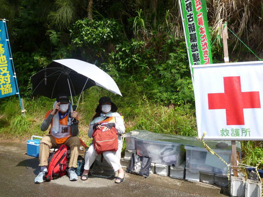 むき出しの炎天下の歩道で、緊急事態に備えて待機する救護班(現役の医師と看護師)。これまで機動隊の乱暴な強制排除によって怪我した人たちを、何十人も救急対応してきた。