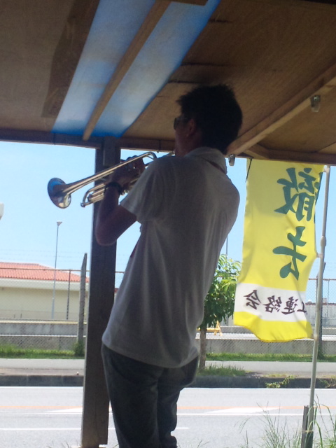 東京から参加したトランペットの上手な青年。若者らしい感性で今の政治状況を批判。「敗戦で、朝鮮や台湾は日本の植民地から解放されたが、いまだ北海道(アイヌの地)と沖縄は植民地のままだ。新基地建設を断念させることで植民地からの解放を勝ち取ろう」と基地に向かって力強く「沖縄を返せ」「ガンバロウ」を演奏した。
