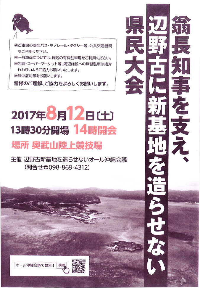 8月12日(土)は県民大会です! 主催のオール沖縄会議では、3万人規模の集会を目指しています。猛暑の中での屋外集会で参加人数が懸念されますが、一人でも多くの県民、国民が参加くださるよう呼びかけます。 翁長知事も参加の予定です。 沖縄~平和のメッセージ 2017年8月8日unaiリンクURL この記事を共有する → Tweet Pin It