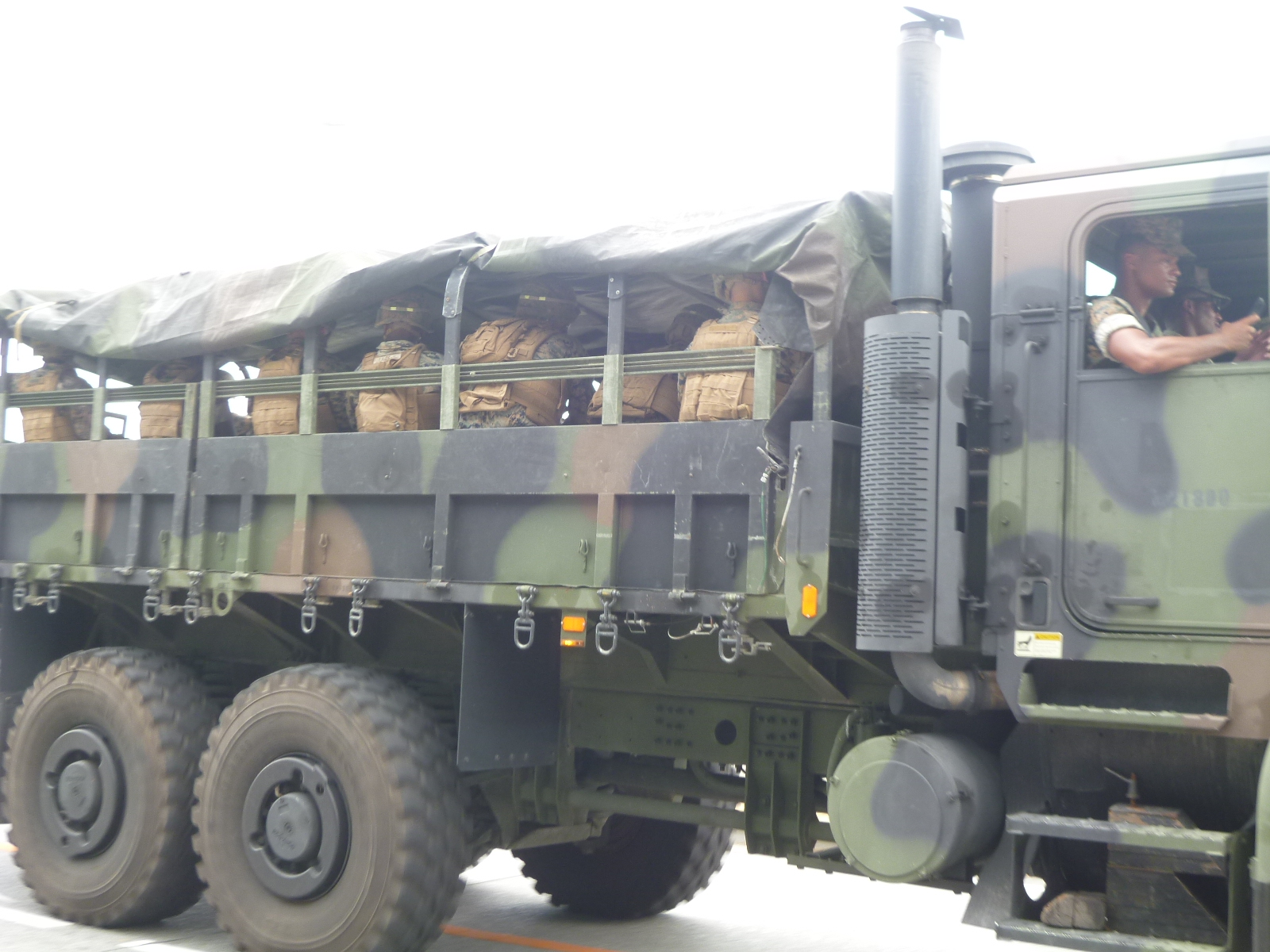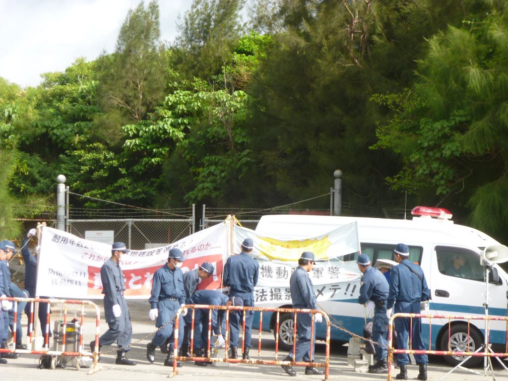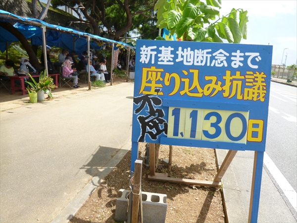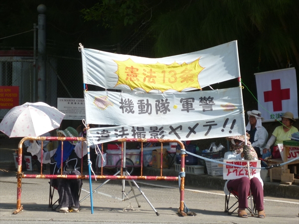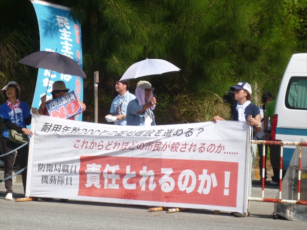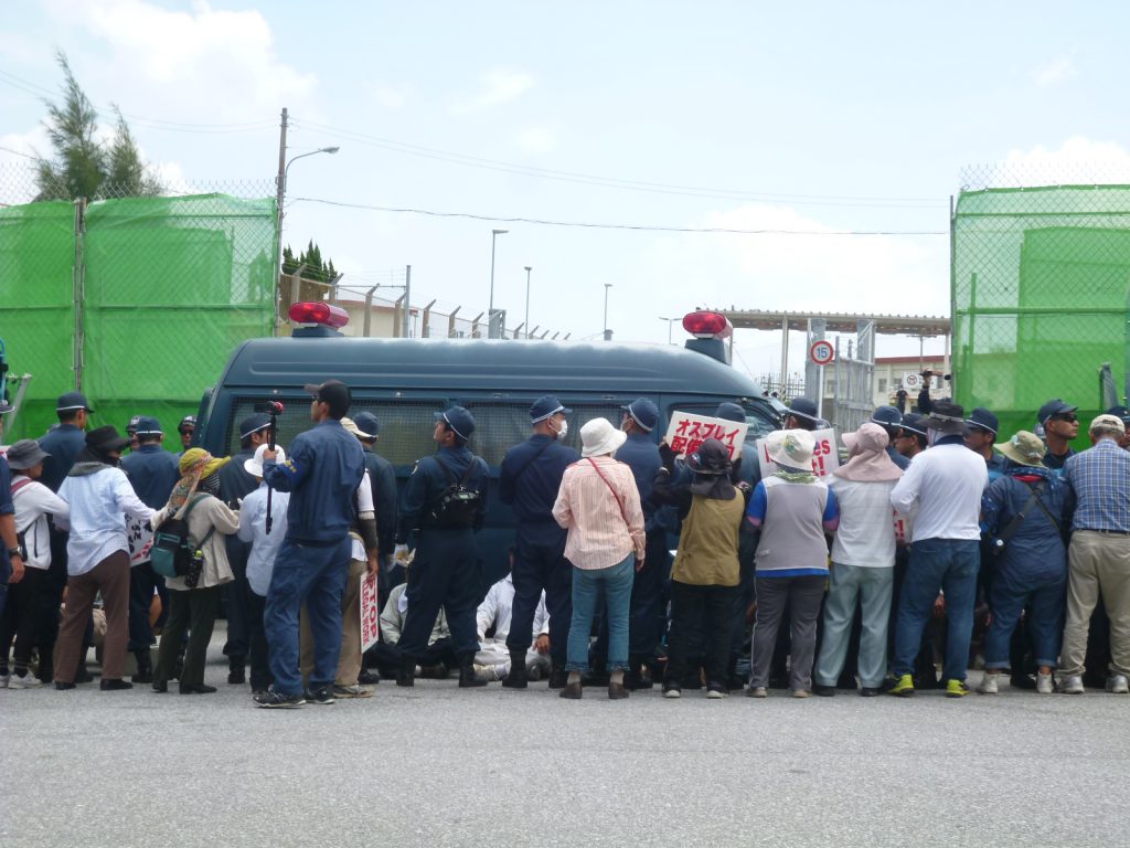 休憩中も訓練に向かう米兵を満載した軍車両に、NO BESE(基地はいらない)のプラカードを表示して抗議。