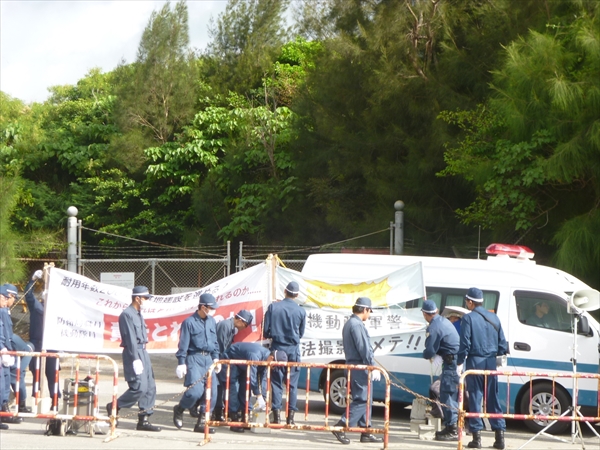 午前中ダンプ・トラックの動きがなかったので、メインゲート前のテント下に移動して昼食休憩をしていると、機動隊が工事用ゲートに向かって行ったので、私たちも急いで駆けつけたが、機動隊に先を越され、座り込む場所を塞がれてしまう形に。